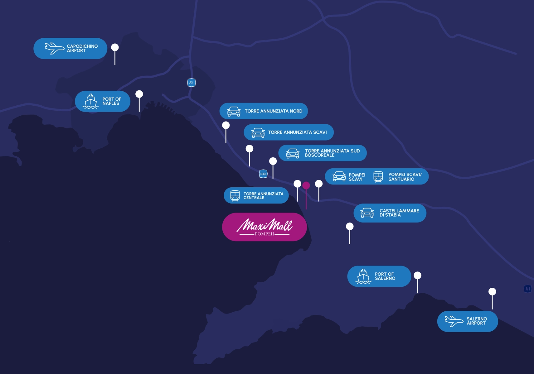 Le aree congressuali sono inserite all’interno del centro commerciale MaxiMall Pompeii che può offrire ai partecipanti momenti di svago e una diversificata offerta di ristorazione.